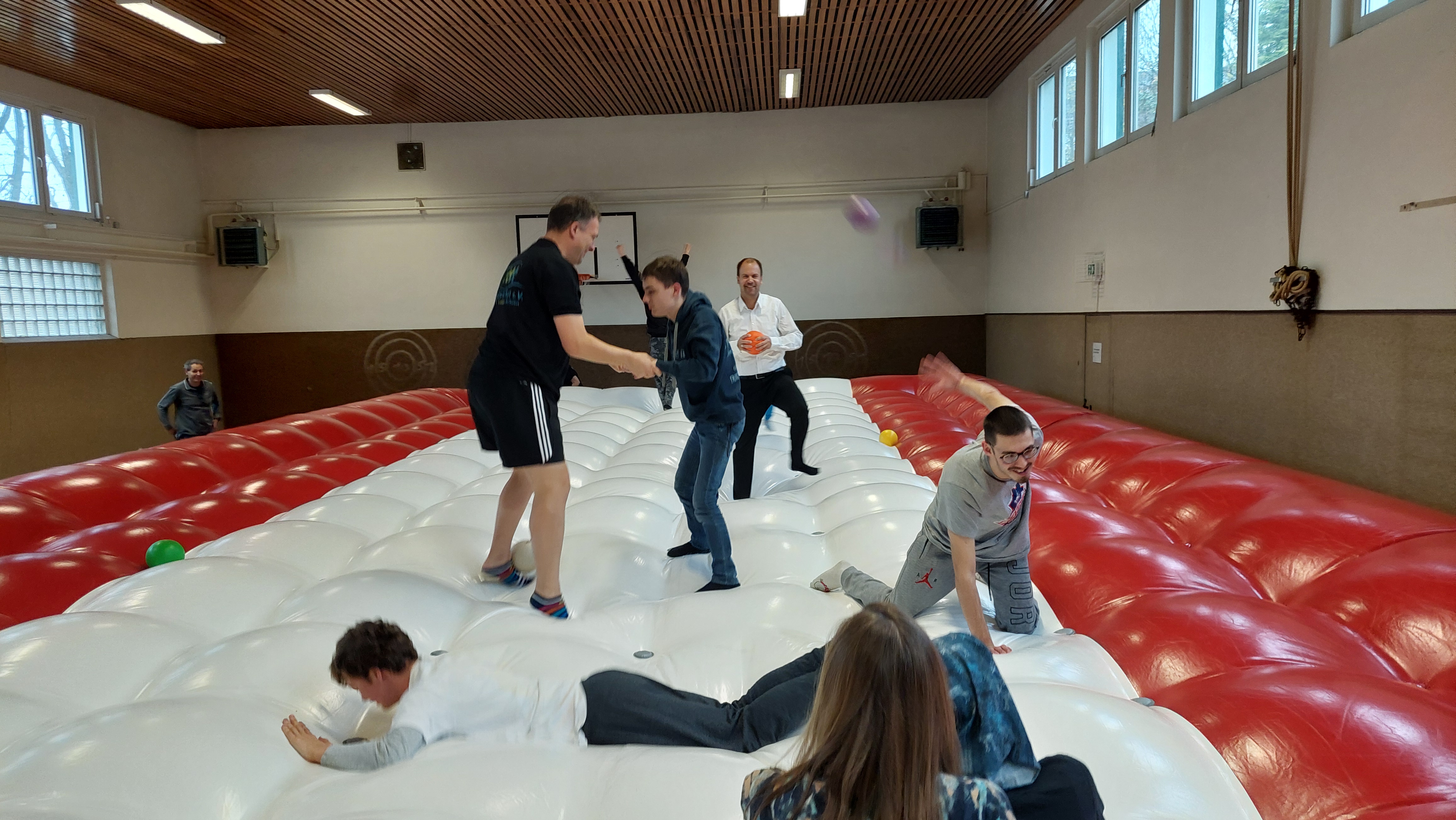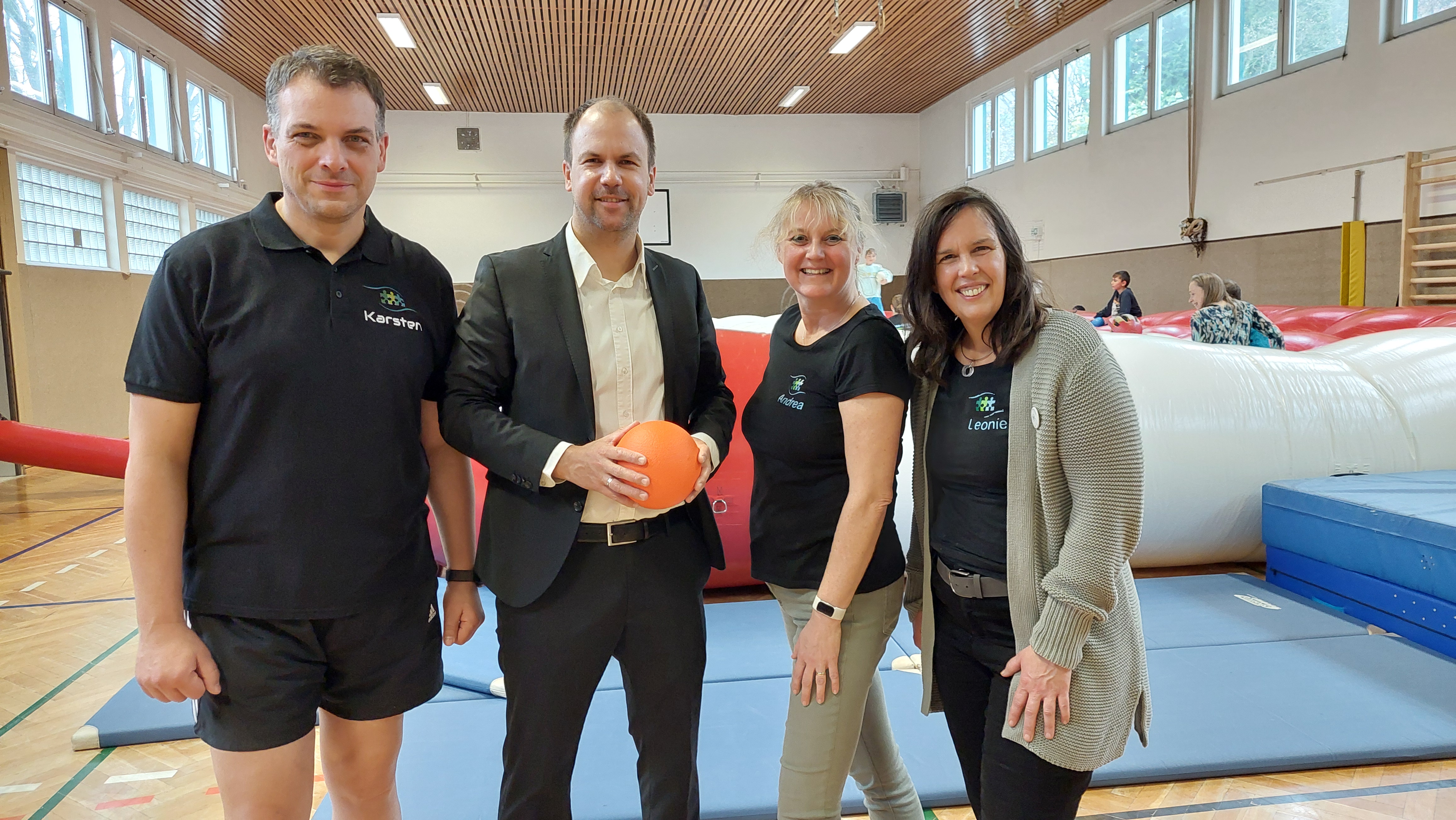 In der Turnhalle der Engelhard-Grundschule kam er mit einigen Vereinsmitgliedern sowie den Vorsitzenden Leonie Knapp und Andrea Schulte und Schatzmeister Karsten Voss ins Gespräch. Natürlich ließ es sich Heine nicht nehmen, selbst eine schwungvolle Runde auf dem großen Airtramp zu drehen – ein pädagogisches und therapeutisches Luftkissen, das der Verein dank des Regionalbudgets der LEADER-Region „Börde trifft Ruhr“ anschaffen konnte und regelmäßig zu den Familientagen aufbaut.