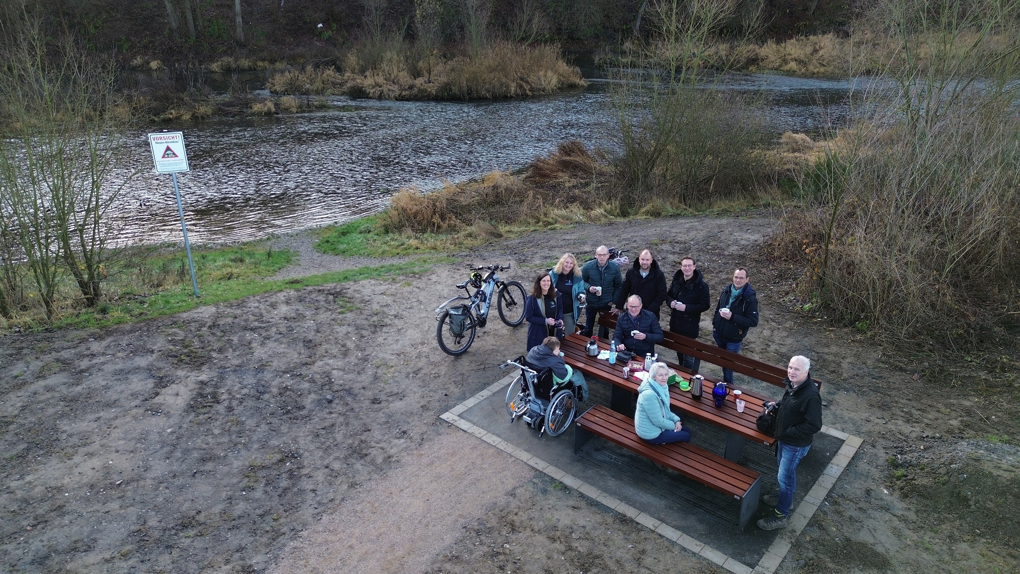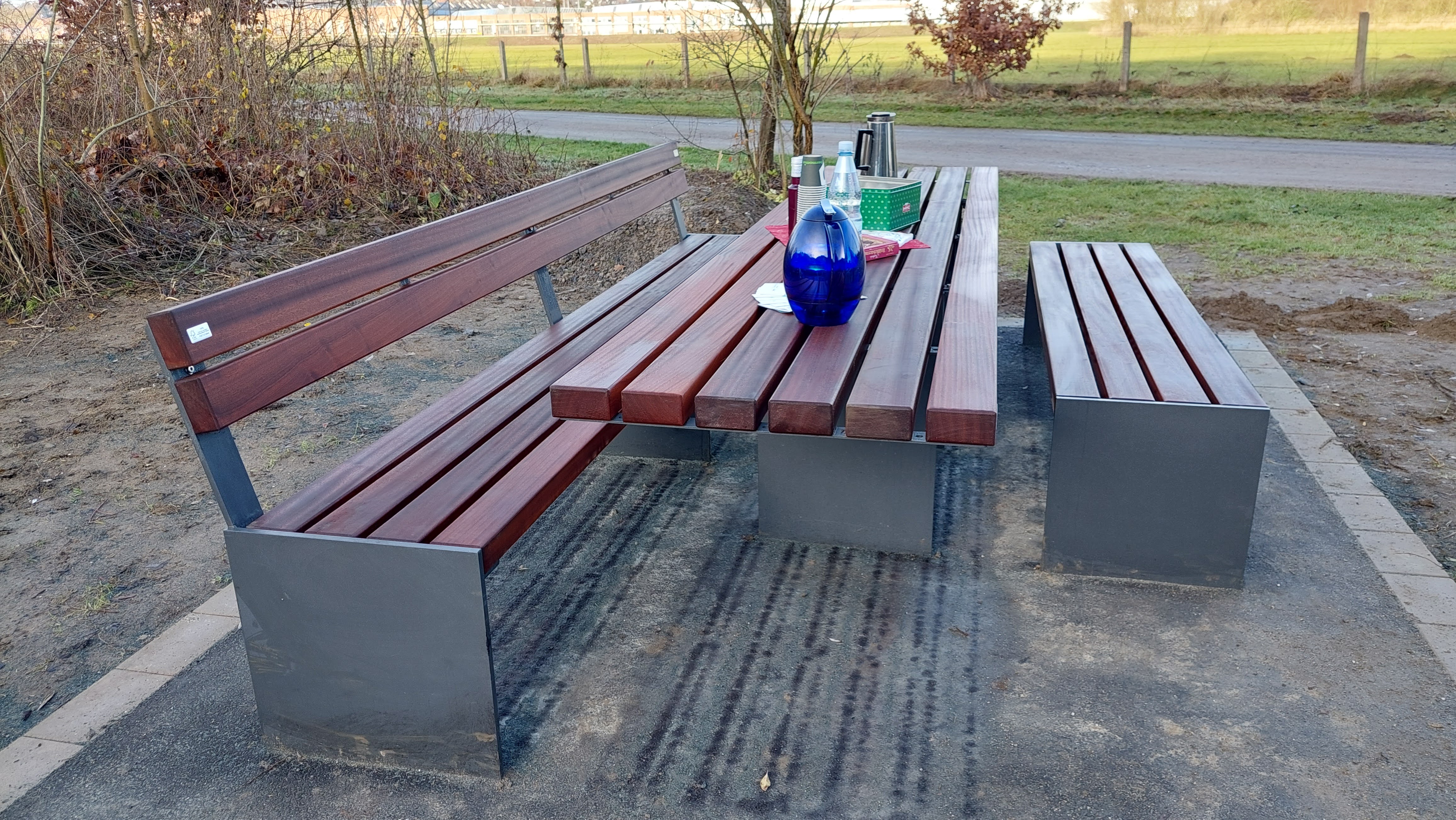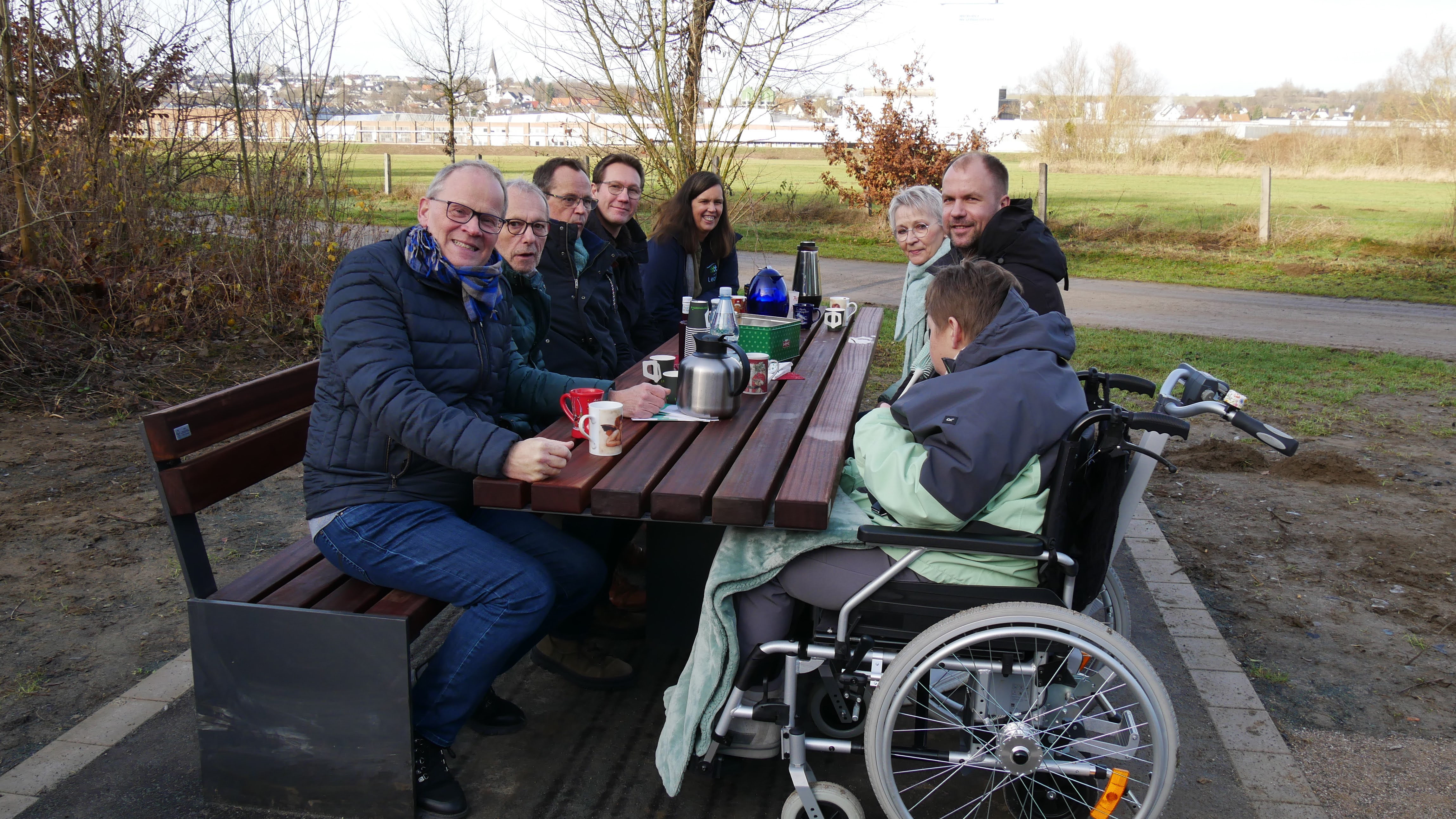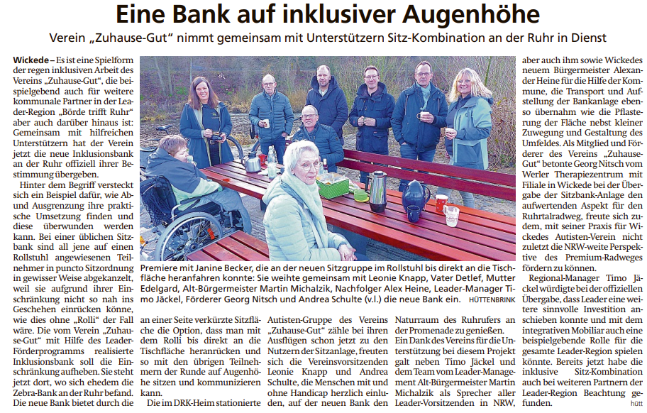 Wir laden Euch herzlich zum Ruhrufer ein, nehmt Platz, ob mit oder ohne Rollstuhl und genießt die Stille und die Natur. Im April hatten wir die Idee bei der Leader-Region "Börde trifft Ruhr" einen Antrag auf Förderung aus dem Regionalbudget 2025 zu stellen. Und zwar für eine inklusive Bank-Tischkombination. Der Clou dabei: eine Bank ist kürzer, hier sitzt der Rollstuhlfahrer direkt mit an der Längsseite des Tisches. Denn wir möchten Menschen im Rollstuhl integrieren, sie sollen einen Platz am Picknicktisch bekommen, wenn sie in der östlichen Ruhrpromenade die Natur beim Spaziergang genießen. Inklusion leben und Rahmenbedingungen schaffen ohne Ausgrenzung. Nach der Einholung von Angeboten und der Antragstellung sowie des Bewilligungsverfahrens wurden die Sitzmöbel im Dezember aufgestellt.