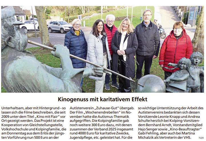 Aus diesem Grund erhielt unser Verein Zuhause-Gut eine Spende in Höhe von 500 Euro aus der Veranstaltungsreihe „Kino mit Flair“ sowie zusätzlich 300 Euro von der Kolpingsfamilie Wickede. Wir bedanken uns herzlich für diese großzügige Unterstützung und das Vertrauen in unsere Arbeit.