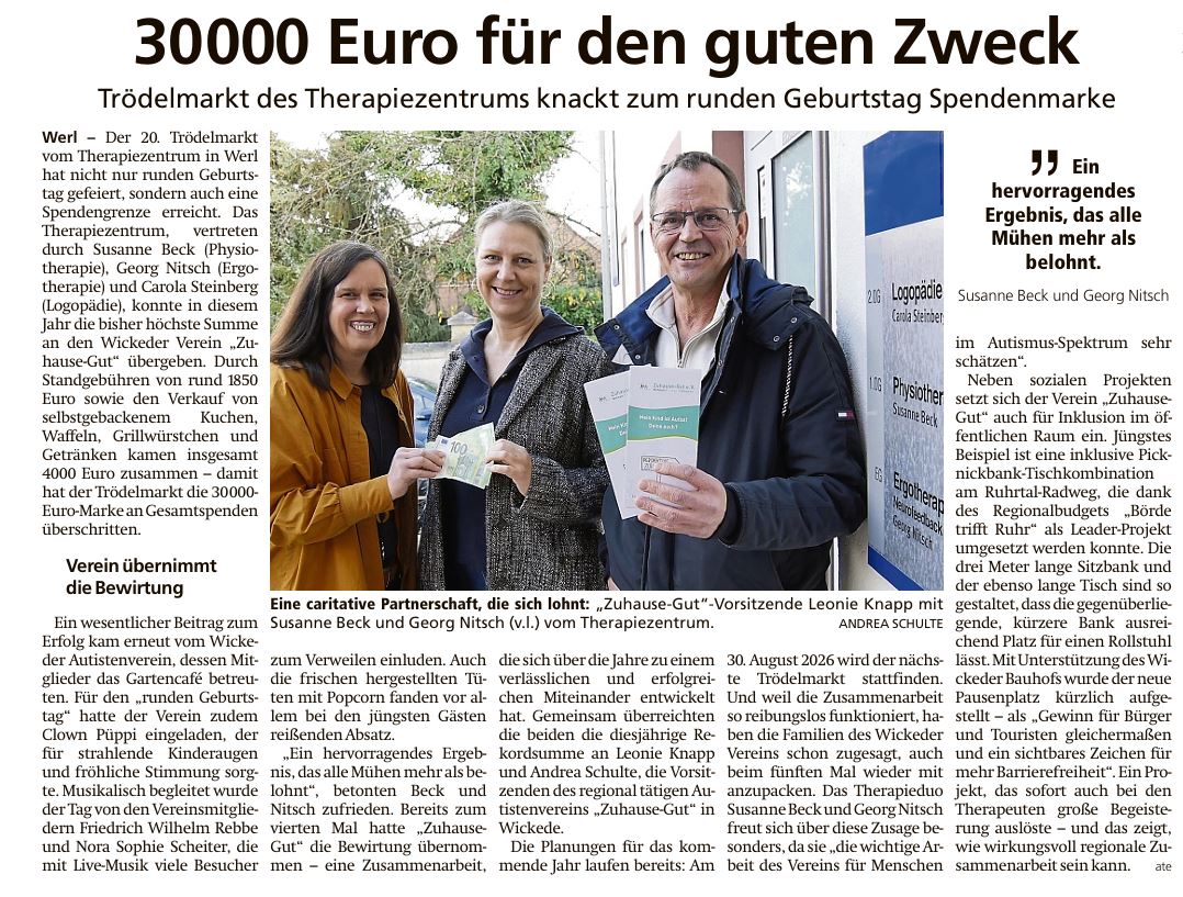 Wir bedanken uns herzlich bei Susanne Beck, Georg Nitsch und Carola Steinberg vom Therapiezentrum in Werl. Der 20. Trödelmarkt hat die 30 000 Euro Marke auf 33 000 Euro gesprengt. So viel haben sie in den vergangenen Jahren an karitative Organisationen spenden können. Mit unserem starken Einsatz, dem Verkauf von selbstgebackenen Kuchen, Kaffee, Grillwürstchen und Getränken sowie den Standgebühren kam in diesem Jahr eine Spende von 4000 Euro zusammen.